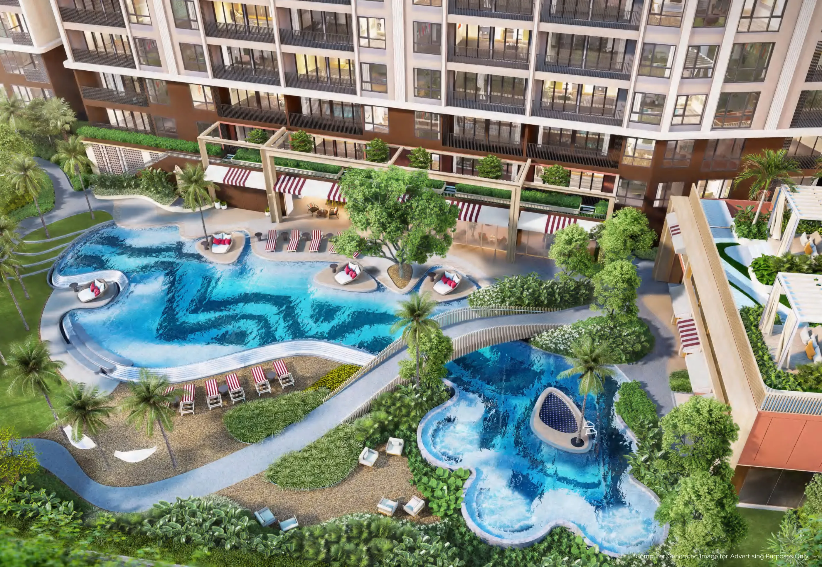 SO Origin Kata is a complex of four 8-storey buildings with architecture that is in harmony with nature. The project includes recreation areas, roof gardens, swimming pools and lounge areas. Facilities include a lobby, co-working space, a fitness room, a sauna and children's playgrounds.