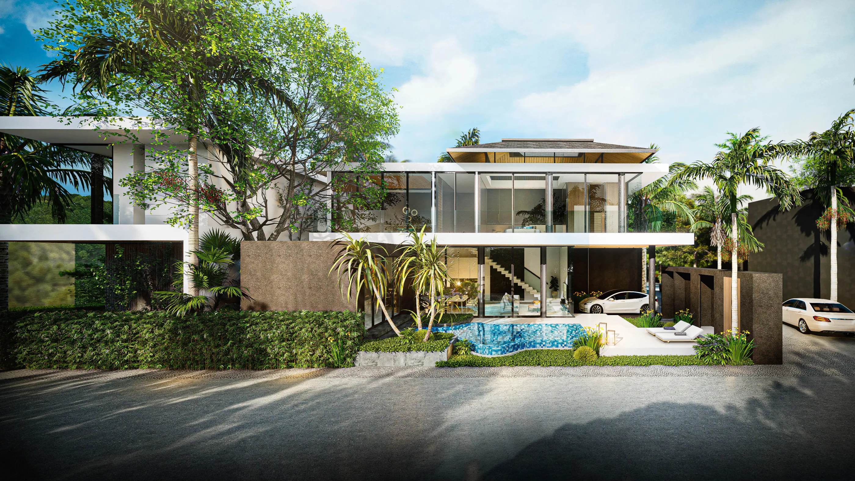 Aileen Villas Layan сочетает в себе современный дизайн и роскошь, предлагая просторные жилые помещения с большими стеклянными раздвижными дверями, обеспечивающими обилие естественного света и плавный переход между внутренними и внешними пространствами.