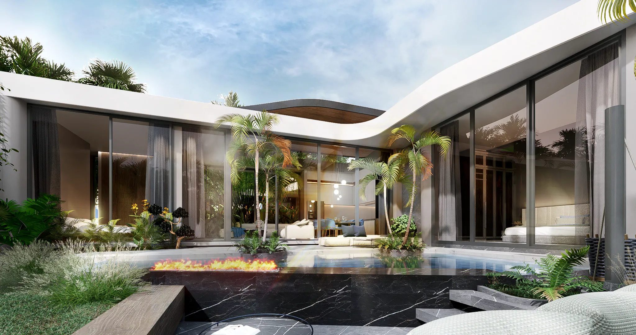 Все виллы имеют 3 спальни и 3 ванные комнаты, оборудованы системой умный дом для управления всеми системами обеспечения и поддержания микроклимата, в том числе удаленно. Внешняя площадь застройки с террасами составляет 233 м2, эксплуатируемая площадь под крышей 133 м2. Все виллы сдаются с чистовой отделкой, установленной сантехникой и кухней без электрических приборов.