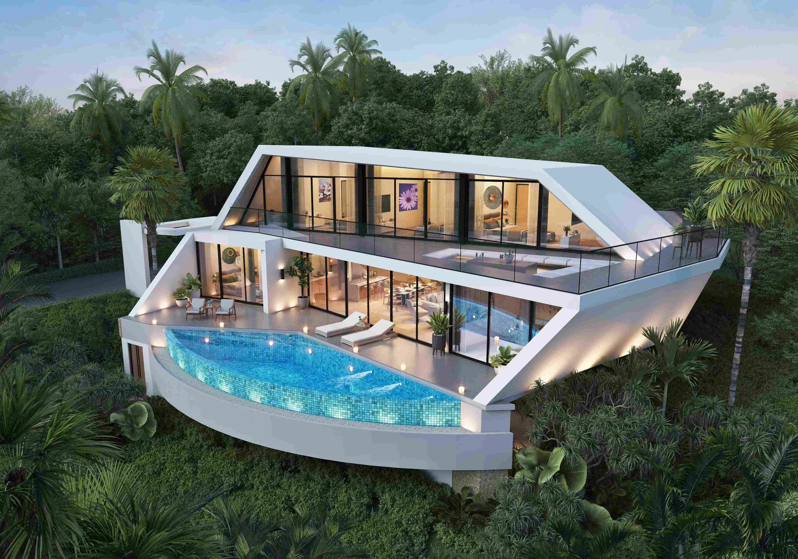 Виллы выгодно отличаются современным дизайном в светлых тонах, уделяется большое внимание в выборе высококачественных материалов от ведущих брендов. Панорамные окна дают лучший естественный свет. Во всех комнатах выполнены отделочные работы, установлены кондиционеры и потолочные вентиляторы, сантехника и встраиваемая мебель и техника.