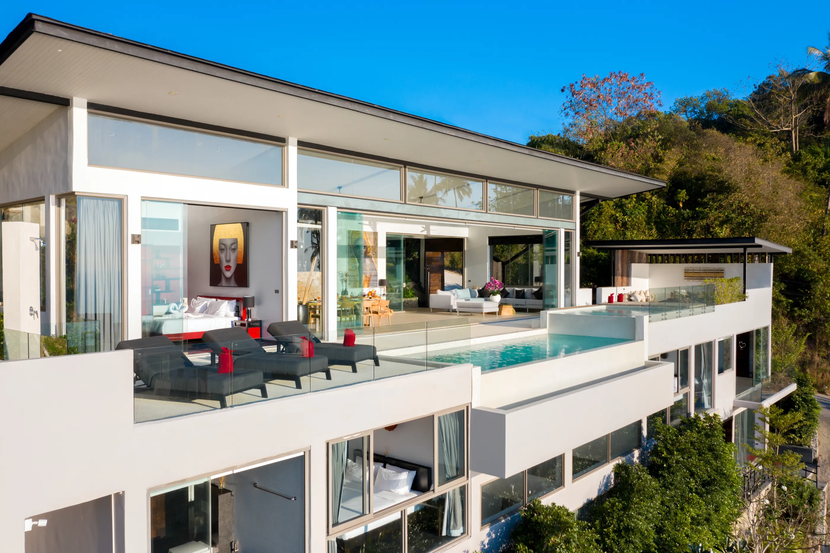 Все помещения находятся на открытом воздухе благодаря панорамным раздвижным стенам. В центре внимания общее жилое пространство включающее в себя столовую на 8 персон и умную кухню.
